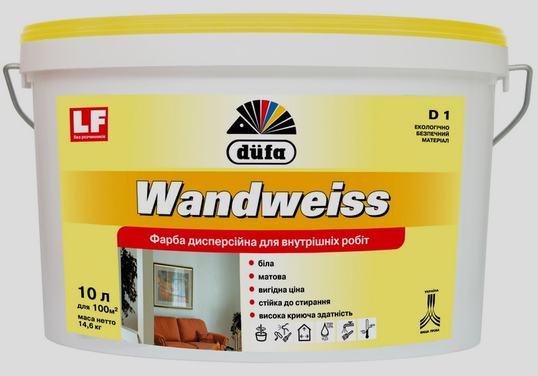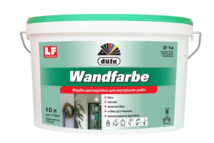 Водоэмульсионная краска Вандфарбе образующая суконно-матовое покрытие выдерживающее легкую влажную уборку и повторное окрашивание. Используется для окраски стен и потолков внутри помещения.