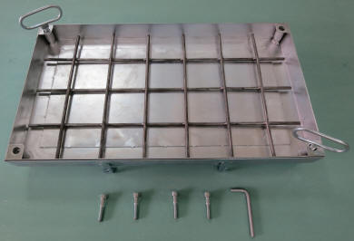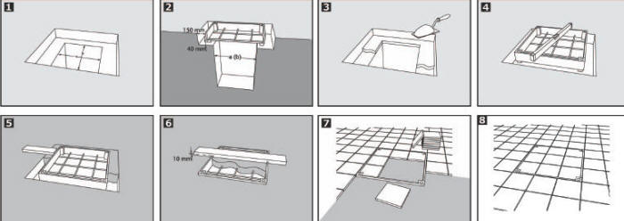 Во время заполнения бетоном, арматурная сетка не должна лежать на дне крышки - её нужно приподнять на 15-20 мм. Распределите бетонную смесь равномерно внутри крышки, учитывая высоту покрытия (напр. плитки) для получения единого уровня поверхности пола и крышки люка.