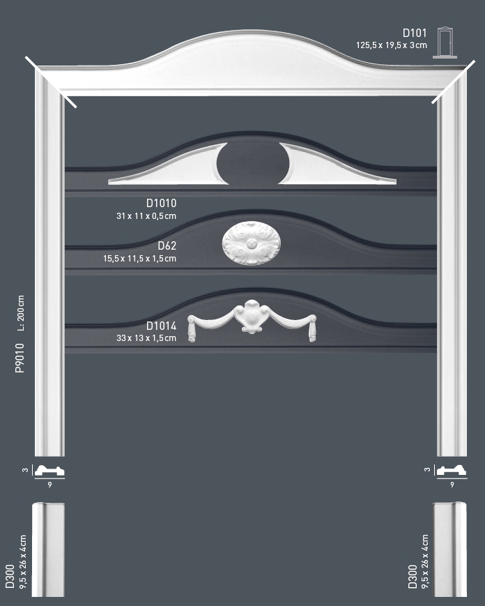Фронтон D401 Ширина - 127.5 см Высота - 14.5 см Толщина - 5.5 см |