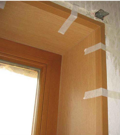 Затем с помощью герметика последовательно наклеиваем боковые и верхний уголки. Фиксируем их малярной лентой. Бывают обои (как правило, бумажные), от которых малярная лента не отходит, сдирая верхний слой. Если клиент не собирается менять обои, это не допустимо. В этом случае зафиксируйте уголки не лентой, а клеем моментального действия в нескольких местах по всей длине.