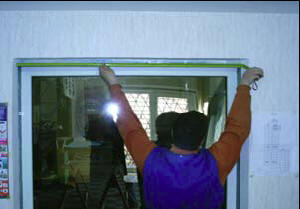 Во время предварительной примерки панели следите за тем, чтобы между ней и рамой не образовалась большая щель (зазоры более двух-трех миллиметров трудно красиво заделать герметиком). Во избежание этого подставьте что-нибудь изнутри перед тем, как начнете производить окончательное закрепление. К примеру, это может быть кусок затвердевшей пены, которой у вас будет в избытке после «шкрябания».