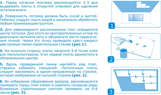 Монтаж потолочной плитки можно сделать быстро и не привлекая квалифицированных специалистов. А из дополнительных материалов Вам потребуется только клей для потолочной плитки из пенополистирола.