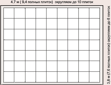 Итого по чертежу считаем 10х8=80 полных плиток ( 20 м2 )