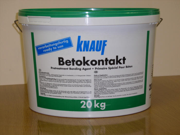 При оштукатуривании потолков из монолитного бетона или бетонных плит гипсовыми штукатурками очень важно обеспечить хорошую адгезию т.е. сцепляемость материалов. Эту проблему решает, спецально для этого предназначенная, грунтовка КНАУФ БЕТОКОНТАКТ.