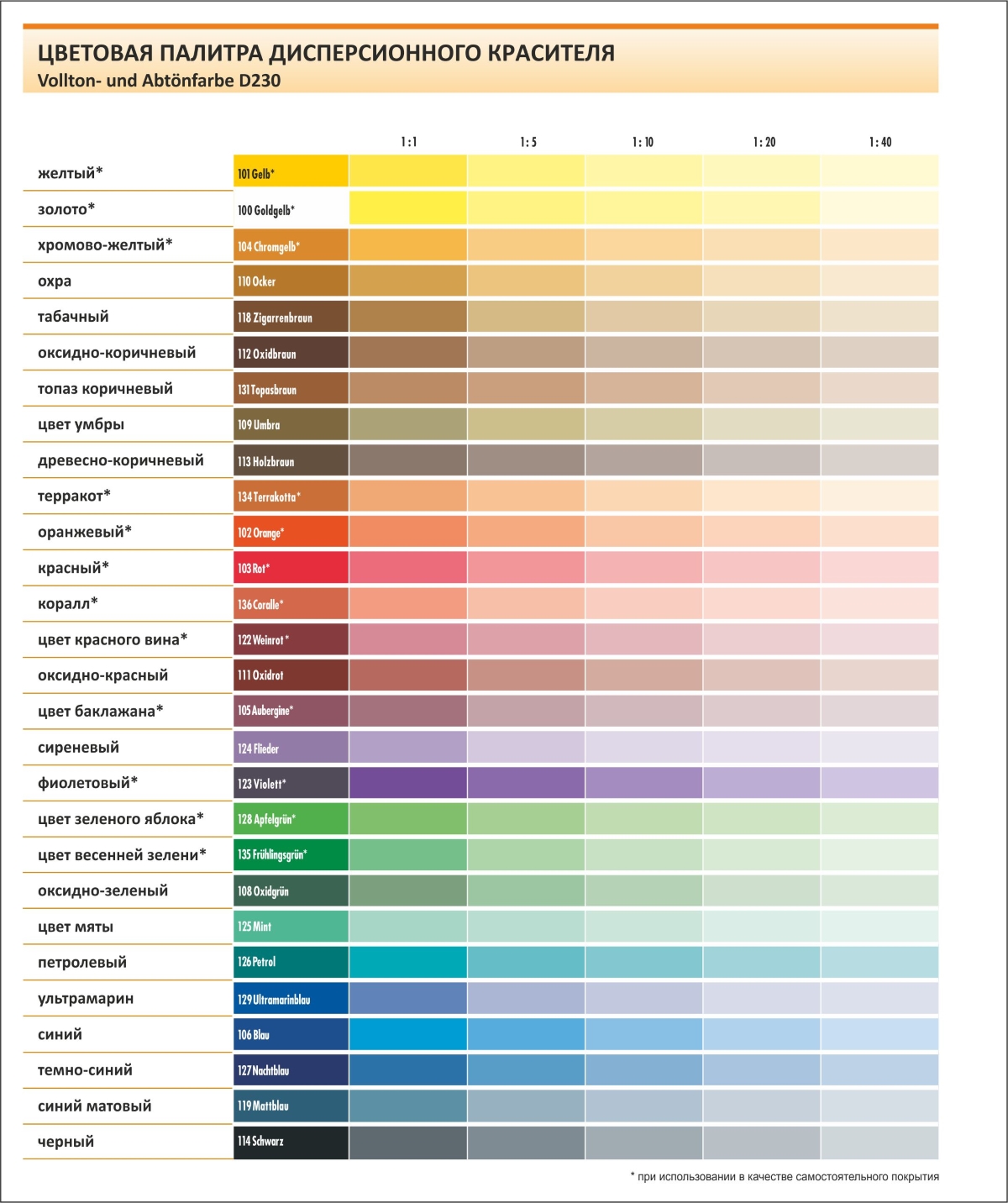 Для колеровки белых дисперсионных акриловых, латексных и клеевых красок и синтетических штукатурок, а также для декоративной отделки фасадных и внутренних поверхностей. Краситель, помеченный звездочкой на цветной маркировке, можно использовать для наружных работ только в неразбавленном виде. Атмосферостойкий, не выгорает.