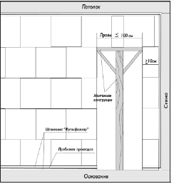 Плиты последнего ряда, примыкающие к потолку, делаются со скошенной гранью. При необходимости плиты обрезаются под конфигурацию перекрытия. Как правило, плиты укладываются горизонтально (на большую грань), однако элементы последнего ряда для уменьшения отходов могут укладываться на меньшую грань вертикально. При этом необходимо соблюдать разбежку торцевых (вертикальных) стыков плит.