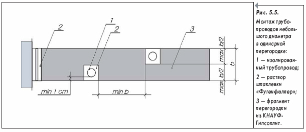 Трубопроводы небольшого диаметра аналогично электропроводке размещают в специально вырезанные штробы и заделывают растворной смесью. Минимальные величины заделки и расстояния между штробами показаны на рисунке 5.5.