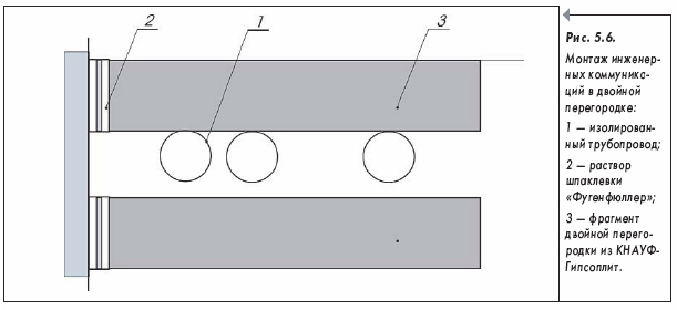 Для размещения труб большого диаметра, групп трубопроводов и воздуховодов необходимо применять двойную конструкцию перегородок. Сначала монтируется одна сторона перегородки, к которой крепятся все инженерные коммуникации. После этого возводится вторая сторона. Трубы не должны соприкасаться непосредственно с перегородкой, их необходимо тепло и звукоизолировать. Кроме того, внутренний промежуток можно заполнить изоляционным материалом. После крепления всех коммуникаций и изоляции монтируется вторая сторона перегородки (рис. 5.6).