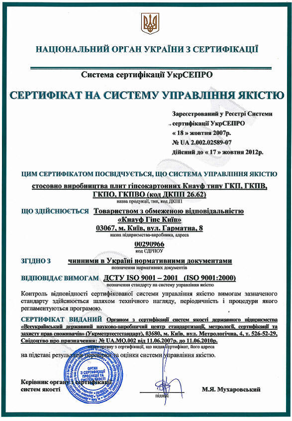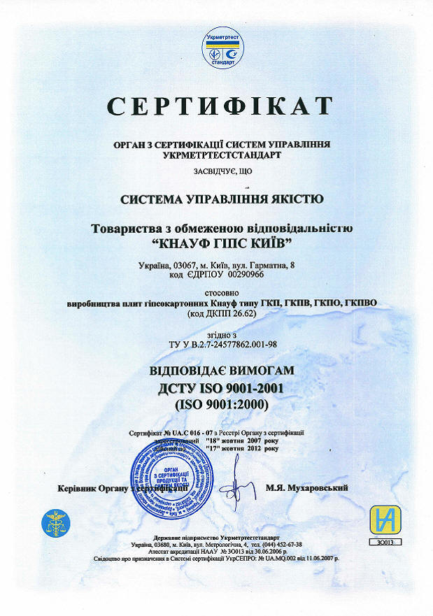 В течение всего технологического процесса и по его окончании Гипсокартонный листы проходят жесткий технический контроль, производимый на основании приемо-сдаточных испытаний по всем показателям качества, предусмотренным ГОСТом 6266—97, поэтому, если Вы выполнили наши рекомендации по транспортировке и хранению, КНАУФ гарантирует соответствие продукции указанному нормативному документу в течение одного года.