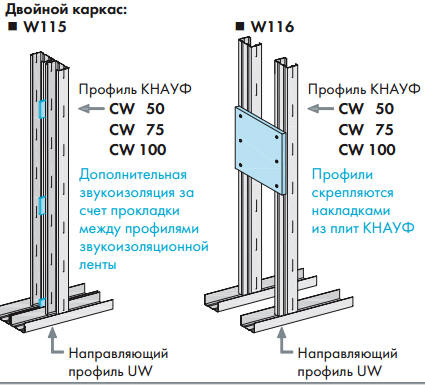 металлического профиля (одинарного или двойного) и обшивки в один, два или три слоя из стенового гипсокартона КНАУФ.